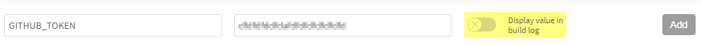 Under the heading Environment variables, add a custom environment variable named GITHUB_TOKEN, with the value set to the personal access token that was generated in the first step. Ensure that you toggle variable encryption by clicking on the padlock.